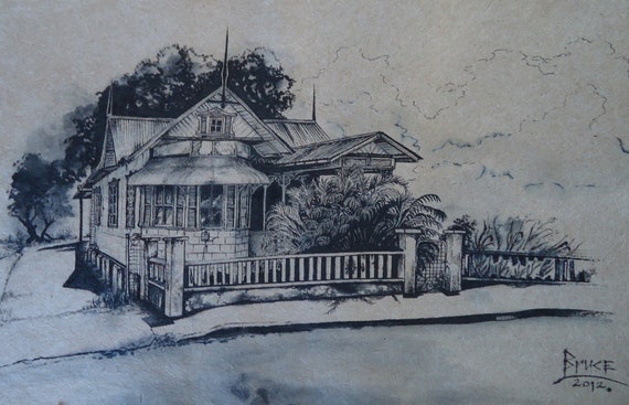 Realistic House Ink Drawing Painting Print Colonial House Etsy